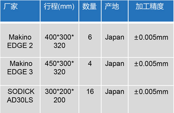 EDM:日本製Makino 10台 加工精度:±0.005㎜ 外観可达到:VDI2-VDI34 EDM:日本製Sodick 16台 加工精度:±0.005㎜ 外観可达到:VDI2-VDI30